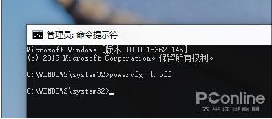 2. 輸入命令“powercfg -h off”回車,如果沒有出現(xiàn)錯誤提示,則代表禁用成功;