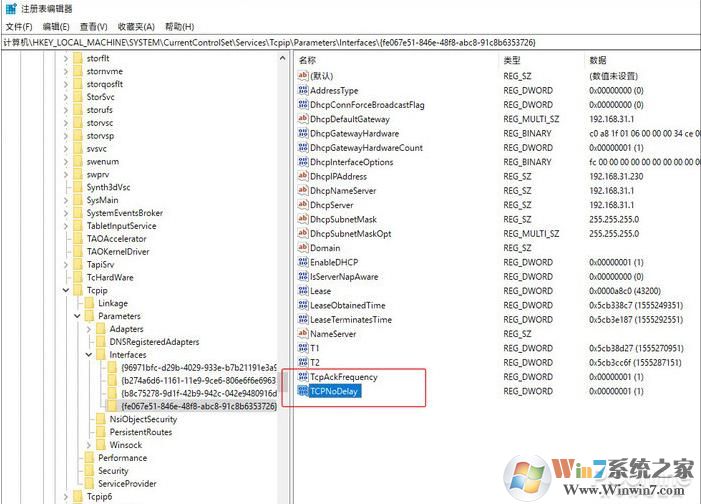 依次點擊這些文件夾,找到包含有“DhcpIPAddress”的文件夾,右擊并建立兩個DWORD(32)值,分別命名為“TcpAckFrequency”和“TCPNoDelay”,鍵值統(tǒng)一設為“1”。重新啟動電腦,Nagle禁用完成!winwin7.com