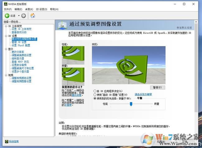 調(diào)整顯卡的3D設置也是日常中一個立竿見影的方法,N卡A卡都適合。右擊桌面空白部位,選擇“Nvidia控制面板”(以N卡為例),接下來進入“3D設置→通過預覽調(diào)整圖像設置”標簽,選擇“使用我的優(yōu)先選擇,側(cè)重于”。接下來根據(jù)實際情況將滑桿調(diào)至“平衡”或“性能”,反復進入游戲測試即可。
