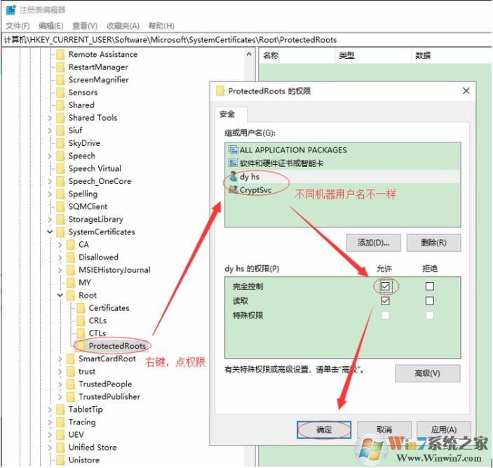 右鍵點權(quán)限,(如果有彈窗,點重新排序,不是每臺電腦都會遇到),把所有用戶名(下圖4個)都設(shè)置成完全控制權(quán)限,點確定,右鍵ProtectedRoots,點刪除,如下圖,如果還不行,看步驟2