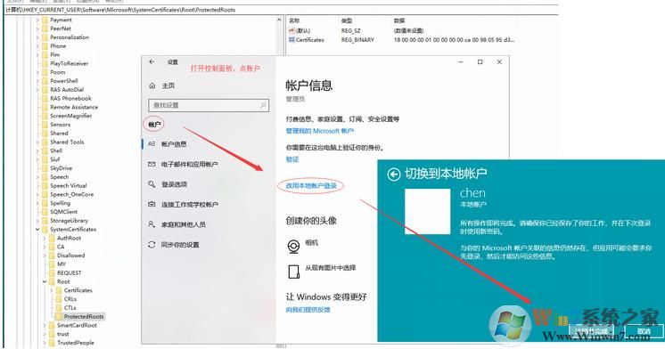 2、如果無法刪除,需要點控制面板,點“賬戶”,點“改用本地賬戶登陸”,然后注銷,再按照上面的步驟刪除,如果還不行,看步驟3