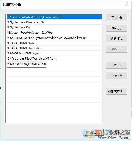 3、在Win10系統(tǒng)下配置mongodb的環(huán)境變量為%MONGODB_HOME%\BIN 設(shè)置好變量值