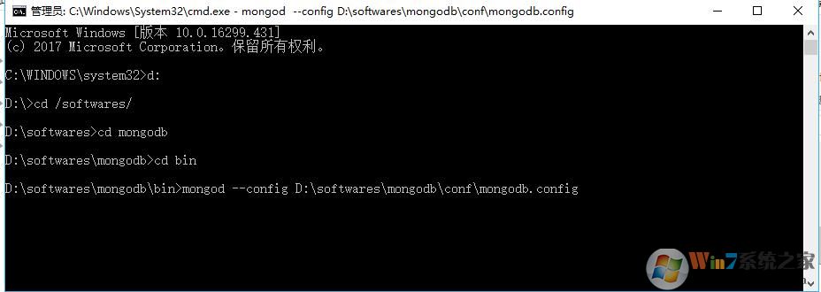 5、到bin目錄 運(yùn)行mongod --config D:\softwares\mongodb\conf\mongodb.config 啟動!