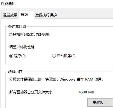 在性能選項(xiàng)中,切換到高級(jí)選項(xiàng)卡,點(diǎn)擊“虛擬內(nèi)存”下的更改。