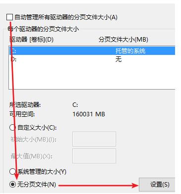 在彈出的虛擬內(nèi)存窗口中,取消勾選“自動(dòng)管理所有驅(qū)動(dòng)器的分頁文件大小”,然后點(diǎn)選下方的“無分頁文件”,點(diǎn)擊設(shè)置,在彈出的提示中點(diǎn)是,最后確定。