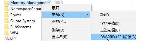 使用小娜或運(yùn)行輸入 regedit 打開注冊(cè)表編輯器,展開到項(xiàng) HKEY_LOCAL_MACHINE\SYSTEM\CurrentControlSet\Control\Session Manager\Memory Management,選擇Memory Management,對(duì)著它點(diǎn)擊右鍵,或在其右邊空白處點(diǎn)擊右鍵,選擇 新建 - DWORD(32位)值,輸入 SwapfileControl 并回車,然后重啟電腦。