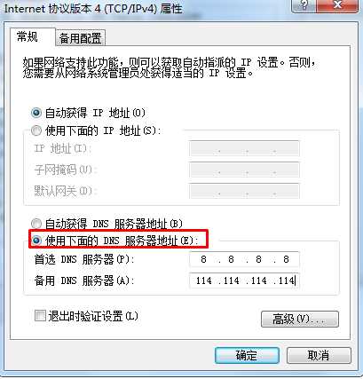 6、這時(shí)我們可以打開(kāi)本地連接屬性界面,雙擊 internet 協(xié)議版本4 (TCP/IPv4)進(jìn)行設(shè)置,打開(kāi)后,我們選擇 使用下面的DNS服務(wù)器地址,然后輸入準(zhǔn)備好的DNS地址 確定保存就可以了!