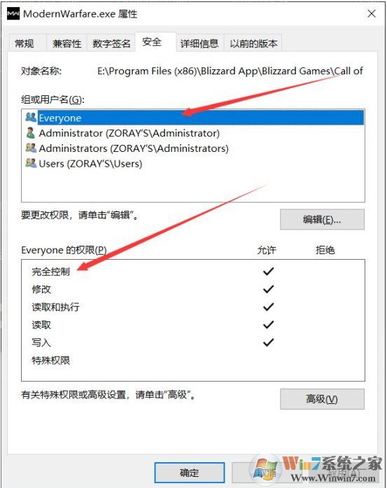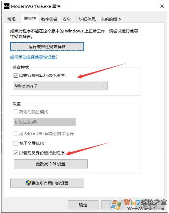 2、右鍵屬性里面設(shè)置win7兼容模式,管理員權(quán)限,然后是設(shè)置權(quán)限里添加一個(gè)Everyone的賬戶,設(shè)置完全控制的權(quán)限。