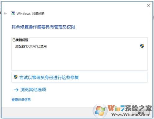 3、當(dāng)網(wǎng)絡(luò)診斷找到一些問題之后,如下圖,系統(tǒng)檢測到“以太網(wǎng)”已禁用,怪不得不能上網(wǎng),可嘗試以管理員身份進行這些修復(fù),或是手動去啟用以太網(wǎng)。