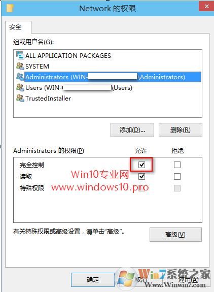 然后點擊“確定”關(guān)閉“選擇用戶或組”窗口,回到“Network的高級安全設(shè)置”窗口,你會發(fā)現(xiàn)“所有者”已經(jīng)變成了你剛才輸入的用戶。然后點擊“確定”關(guān)閉“Network的高級安全設(shè)置”窗口,回到“Network的權(quán)限”設(shè)置窗口。選中“組或用戶名”列表中的“Administrators”,然后在下面的“Administrators的權(quán)限”設(shè)置框中勾選“完全控制”。如圖: