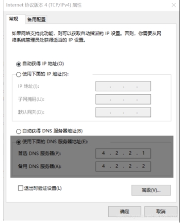 4、將 DNS 服務(wù)器手動設(shè)置為“4.2.2.1” 和 “4.2.2.2”,確定后重試。