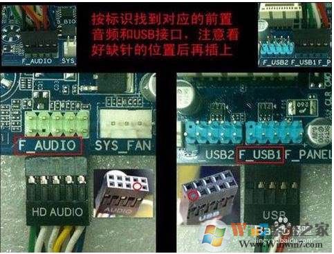 和USB一樣,前置音頻線(xiàn)插頭也是排好了的,找到主板上的AUDIO標(biāo)識(shí)的排針插入即可。