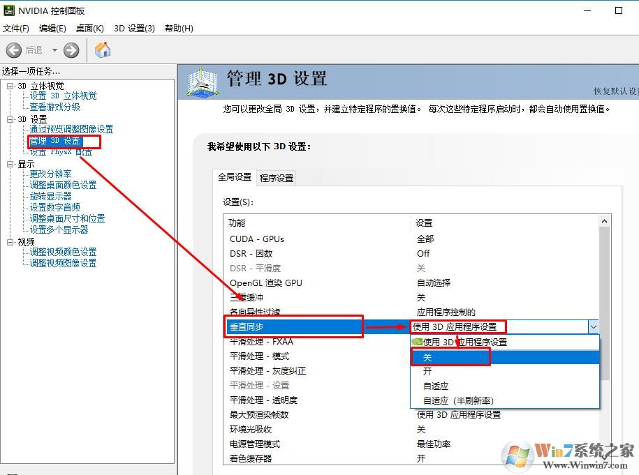 2、管理3D設(shè)置--垂直同步---選擇開即可,如果要關(guān)閉的話也是在這里關(guān)閉的。