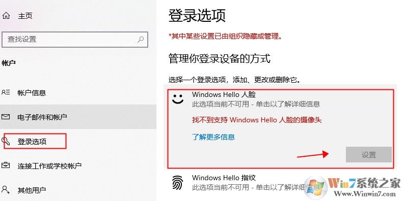 第三步:在賬戶——點(diǎn)擊登陸選項(xiàng),選擇windows hello——點(diǎn)擊設(shè)置(必須有支持人臉識(shí)別的攝像頭)