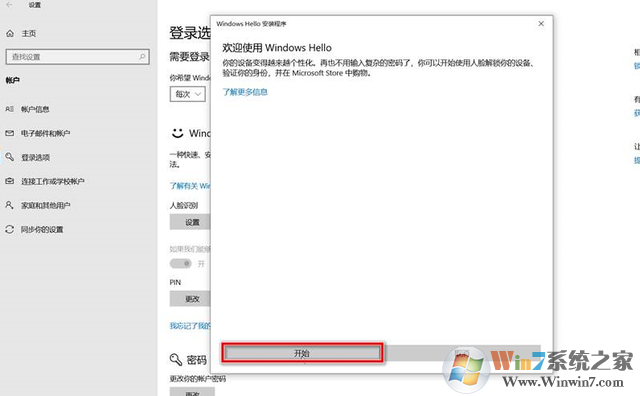4、然后重新打開windows+i 設(shè)置--賬戶--登錄選項(xiàng),單擊以下按鈕上Windows Hello(必須已經(jīng)設(shè)置登錄密碼和pin碼),單擊“Start”(開始)按鈕,攝像頭應(yīng)與預(yù)覽屏幕上工作正常。
