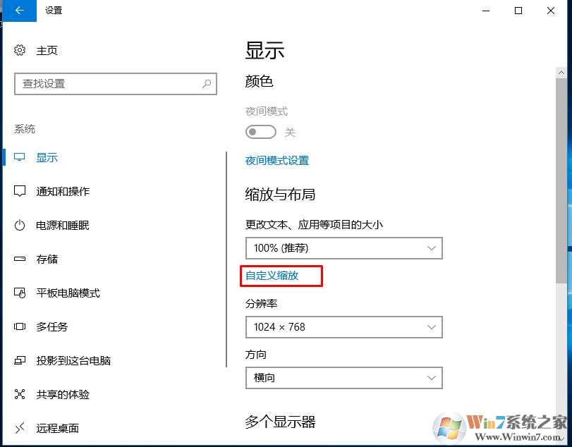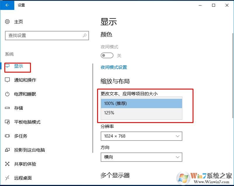 3、然后再點(diǎn)擊左側(cè)的顯示,這時(shí)在右側(cè)就可以看到 縮放與布局,這里可以設(shè)置100% 和125%,自行設(shè)置一下看字體是否達(dá)到你的要求。