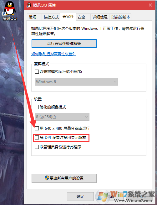 2、為了防止高分辨率下一些軟件自動調(diào)整DPI,那么我們還需要:右鍵點擊軟件圖標(biāo)屬性→選擇兼容性→勾選高DPI設(shè)置時禁用顯示縮放。