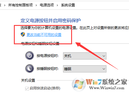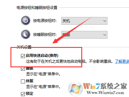 第四步:接著把“關(guān)機設(shè)置”中“啟用快速啟動(推薦)”前面的復(fù)選框?qū)?strong>去掉,保存修改即可。