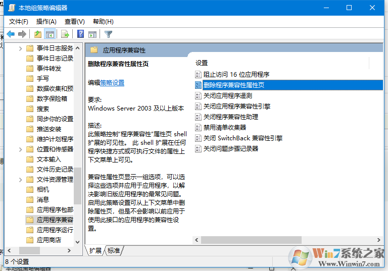 2、在本地組策略編輯器窗口中,展開至“計(jì)算機(jī)配置》管理模板》Windows組件》應(yīng)用程序兼容性”,在右側(cè)找到“刪除程序兼容性屬性頁”并雙擊打開;