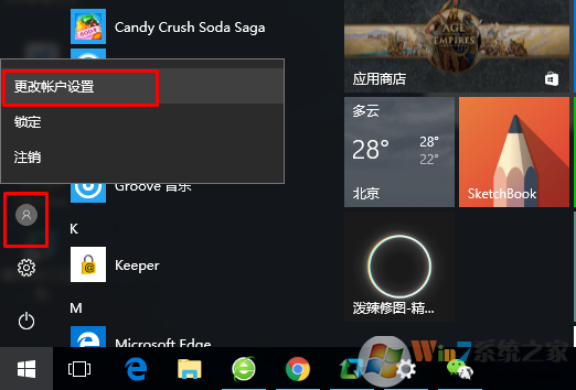 1、打開開始菜單,點擊頭像選擇更改賬戶。