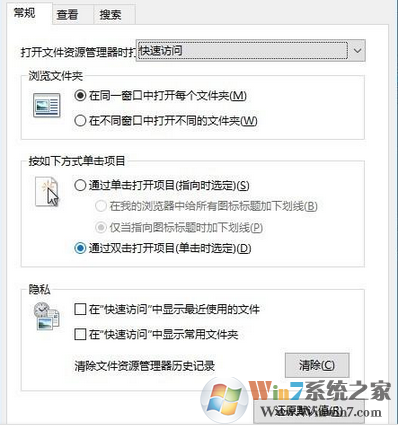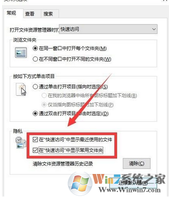 3、在【文件夾選項】界面找到【隱私】,并將【隱私】里面“快速訪問”相關選項前面的括號內打上“√”,如圖