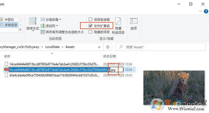 文件夾打開后,你會發(fā)現(xiàn)這里的壁紙全部沒法顯示。要想當(dāng)成壁紙來用,需要首先將文件復(fù)制一份,然后打開“查看-顯示/隱藏-文件擴展名”,為復(fù)制好的文件添加一個“.jpg”后綴,就能正常顯示了。