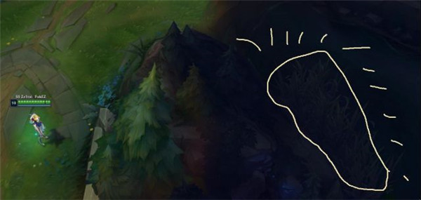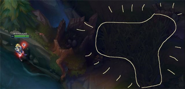 我個(gè)人認(rèn)為這個(gè)是目前最難但是最有價(jià)值的眼位了。你需要點(diǎn)亮的草叢如下圖所示。這個(gè)位置非常容易插出草叢,要注意!(記得練習(xí)的時(shí)候在這個(gè)草叢里面放上敵方假人)