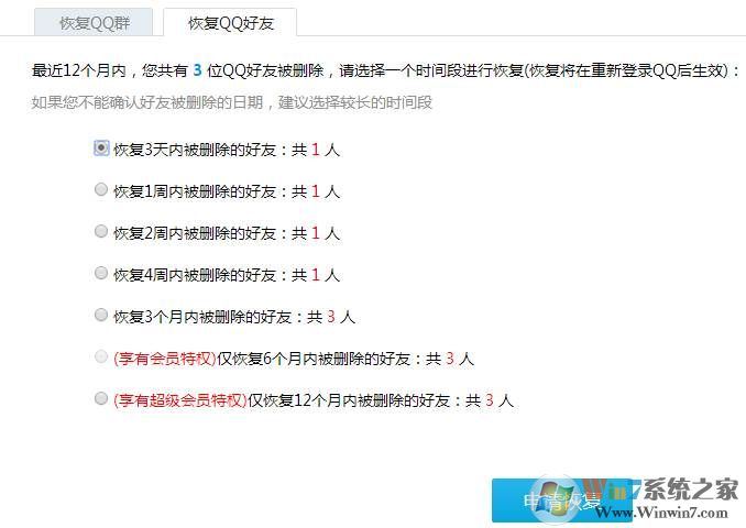 2、這里提供了多個(gè)刪除周期的選擇,按你記憶來選擇要恢復(fù)的好友(在這個(gè)時(shí)期內(nèi)刪除的)點(diǎn)擊申請(qǐng)恢復(fù)