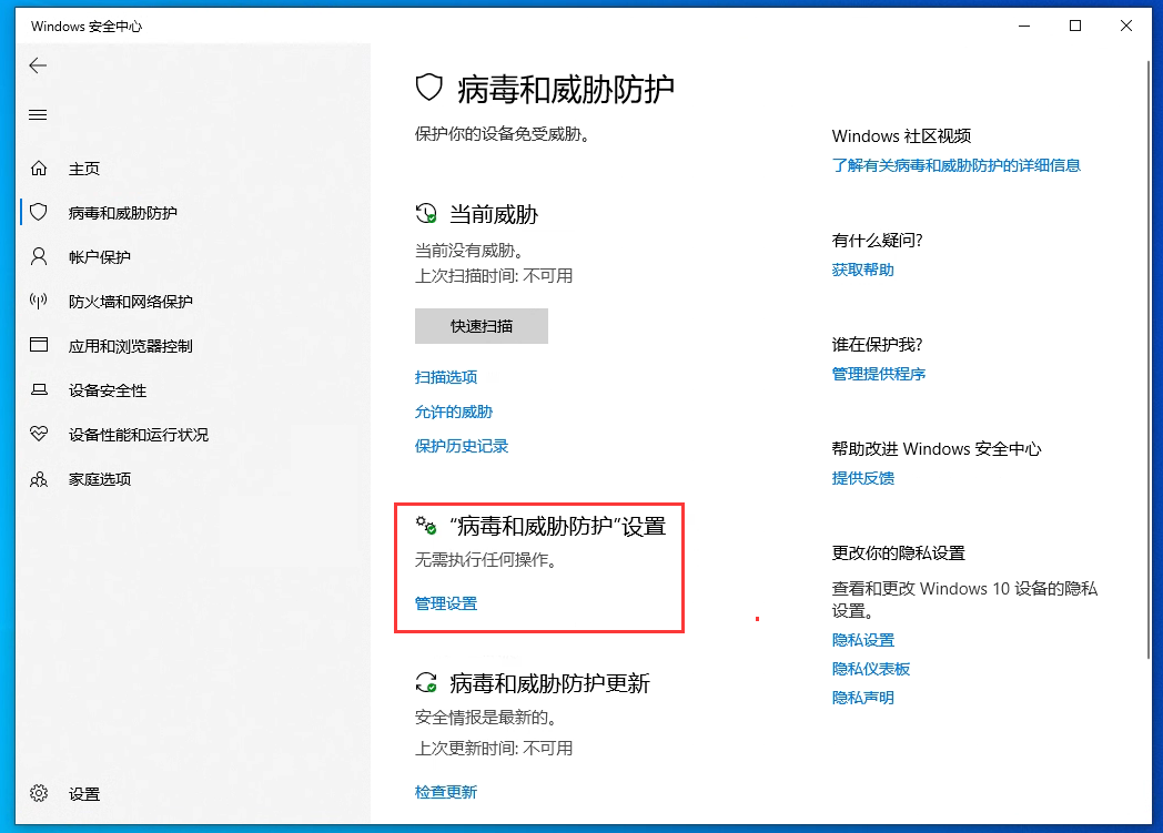 5、選擇“病毒和威脅防護設置”的“管理設置”選項。