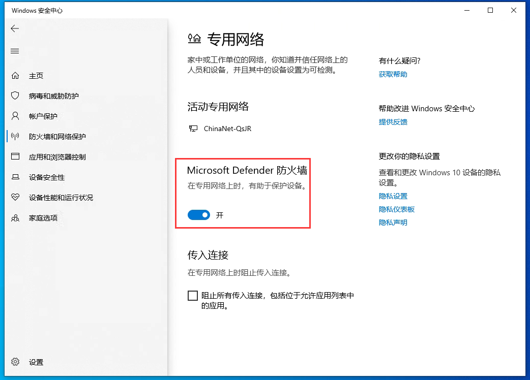 8、點擊“防火墻和網絡保護”,點擊電腦所在的當前網絡,如“專有網絡”,關閉“Windows Defender防火墻”。