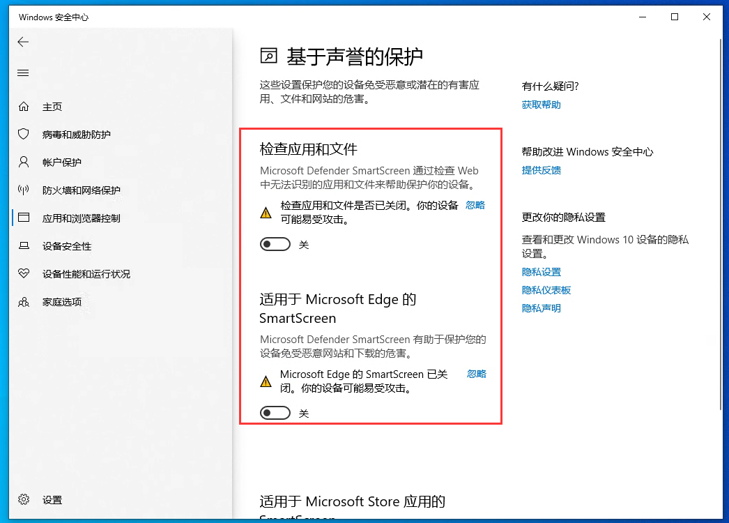 9、在右側的“應用和瀏覽器控制”找到“基于聲譽的保護”,關閉“檢查應用和文件”等功能。