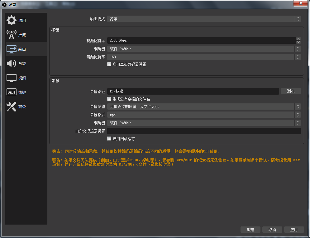 錄像格式中,有好幾種格式可以選擇,MP4、mov等是比較普遍的格式,但在選擇MP4、mov時,系統(tǒng)會彈出一個警告,說是如果錄屏無法完成,保存為mp4、mov等格式的記錄無法恢復,選擇mkv格式就不會彈出這個警告,而且在錄制完成之后,你可以輕松地將mkv轉換為MP4格式。