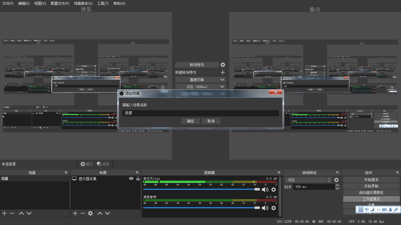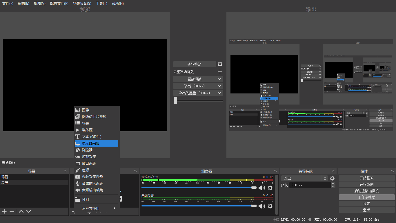 在來源中點擊+號,添加來源,選擇顯示器采集即可。