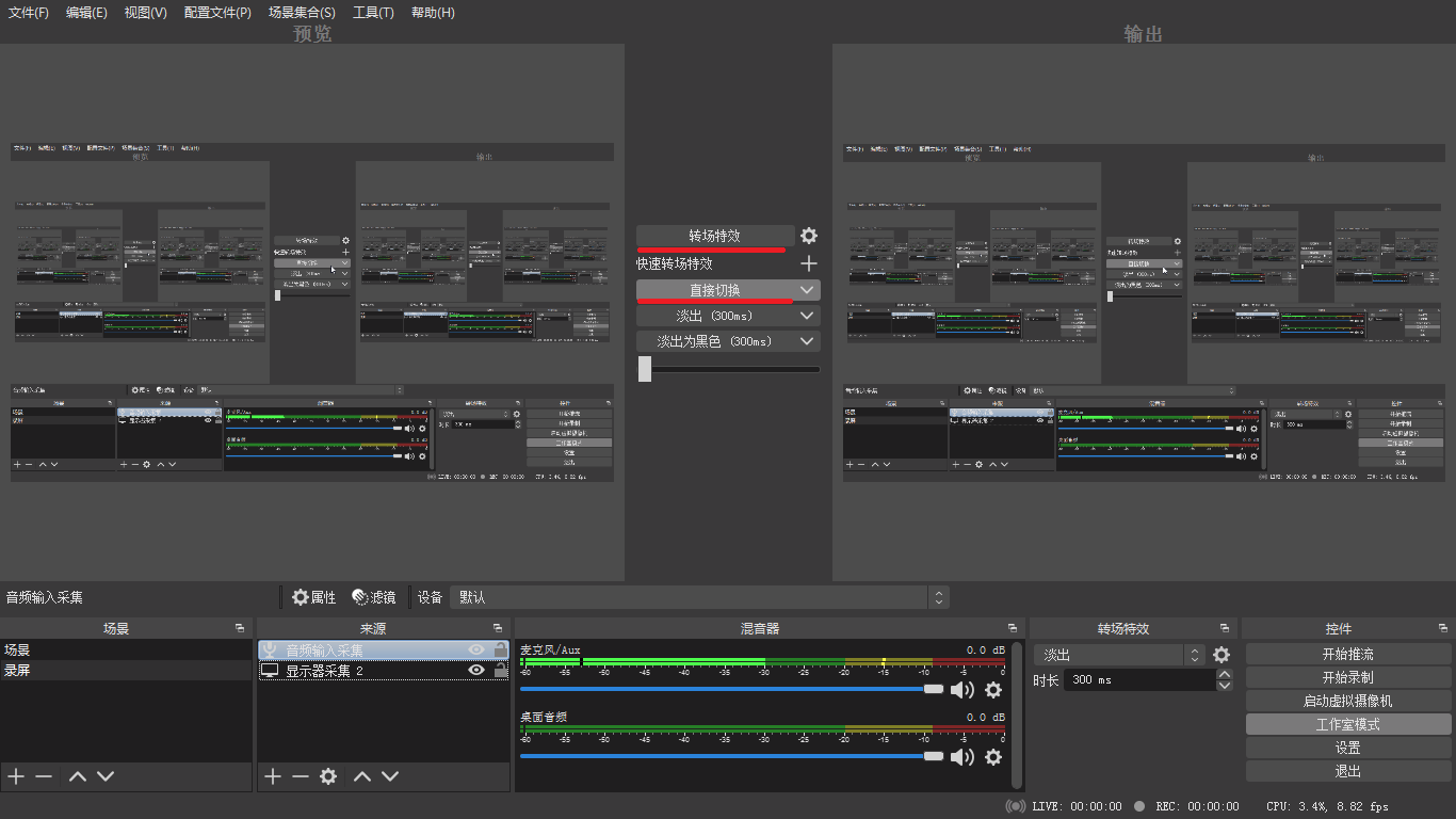 在工作室模式下,選擇轉場特效或直接切換,然后點擊開始錄制,即可開始錄屏,我一般選擇直接切換。