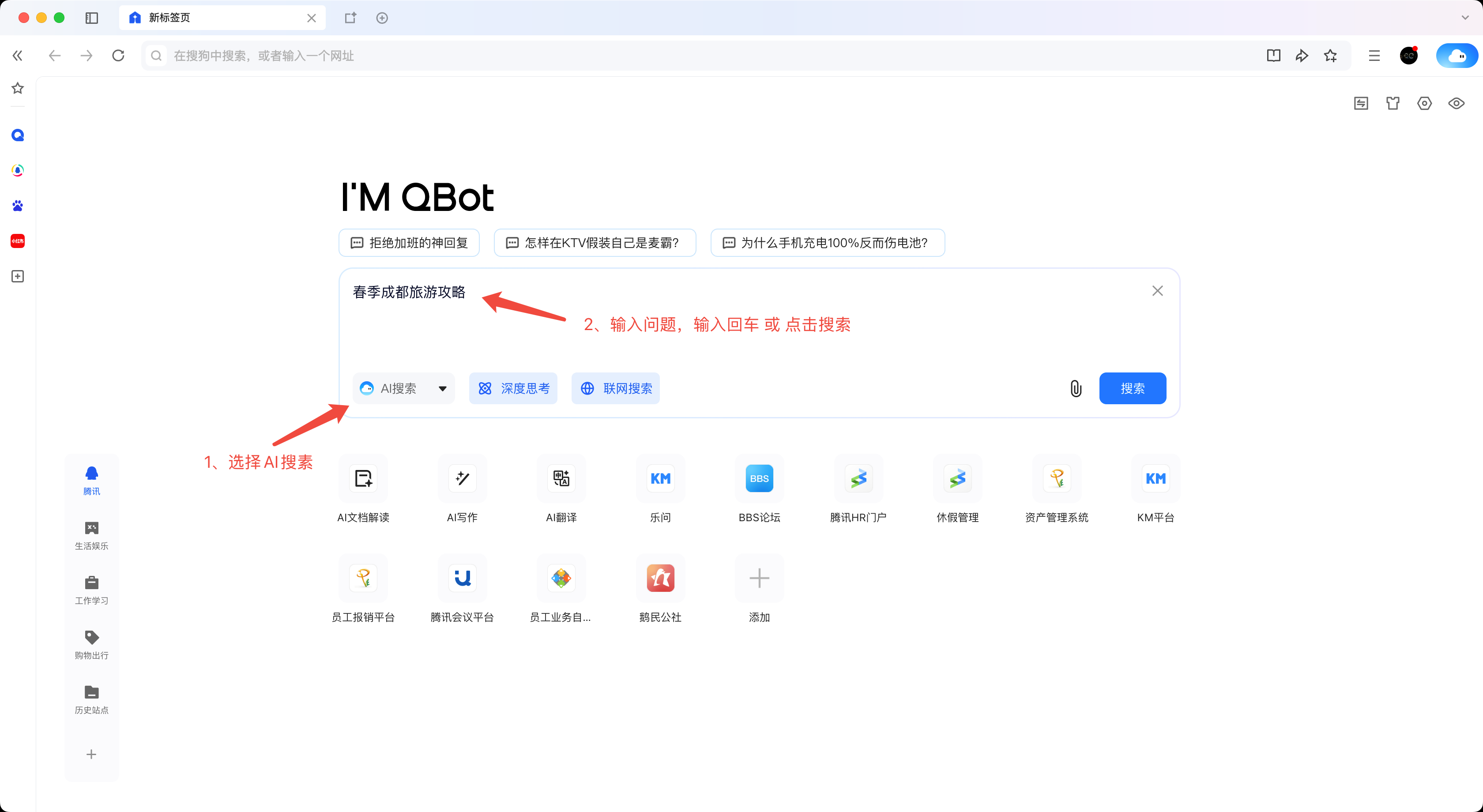 (1)首頁入口:打開QQ瀏覽器首頁,選擇 “AI搜索”,輸入問題后點擊搜索