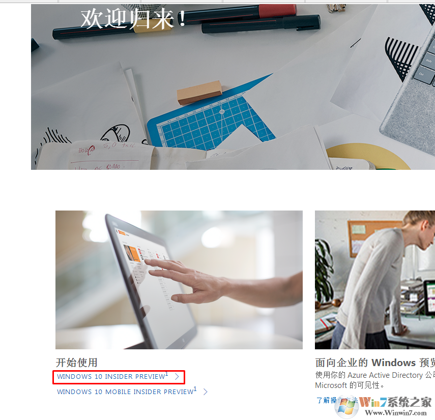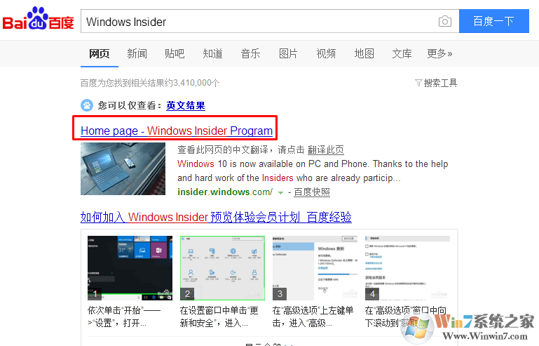 2、這時出現(xiàn)在第一位的就是基本就是微軟Windows Insider的頁面,點(diǎn)擊進(jìn)入