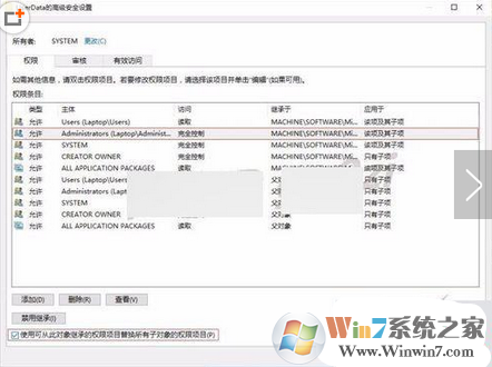 7、在UserData的高級(jí)安全設(shè)置,選擇Administrators 后,勾選 使用可從此對(duì)象繼承的權(quán)限項(xiàng)目替換所有子對(duì)象的權(quán)限項(xiàng)目,點(diǎn)擊 確定 ;