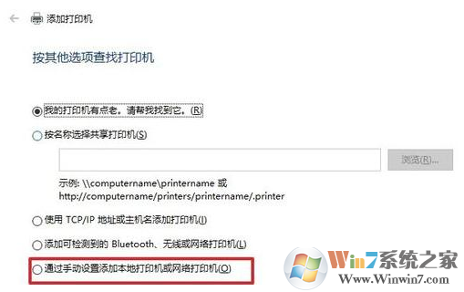 6、可以選擇下面的“通過(guò)手動(dòng)設(shè)置添加本地打印機(jī)或網(wǎng)絡(luò)打印機(jī)”。