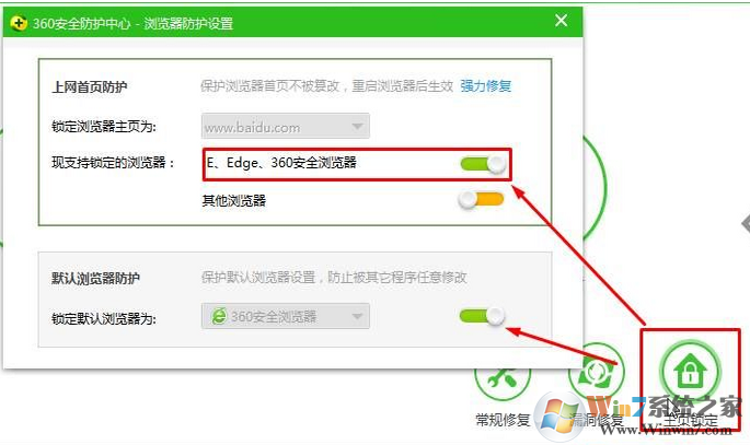 2、點(diǎn)擊“主頁(yè)鎖定”,將“現(xiàn)支持鎖定的瀏覽器”和“鎖定默認(rèn)瀏覽器為”的開(kāi)關(guān)關(guān)閉,在彈出的警告窗口點(diǎn)擊“確定”;