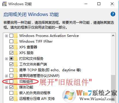 4、點(diǎn)擊啟用或關(guān)閉Windows功能后,會(huì)彈出Windows功能對(duì)話框,拉到最下面,點(diǎn)擊"+”展開(kāi)“舊版組件”。