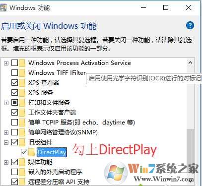 5、如圖所示,展開(kāi)舊版組件之后,勾上“DirectPlay”,再點(diǎn)擊確定。