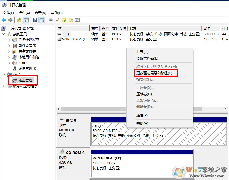 2、稍等一下,右側(cè)窗口會顯示系統(tǒng)磁盤的詳細(xì)信息,我們找到?jīng)]有盤符的移動硬盤,右鍵點(diǎn)擊,在右鍵菜單中點(diǎn)擊:更改驅(qū)動器號和路徑(C)。