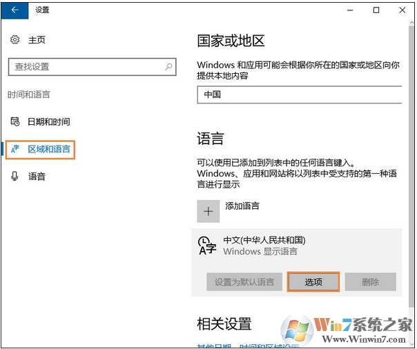 2、點擊“區(qū)域和語言”,在右側(cè)點擊“中文”下的“選項”按鈕。