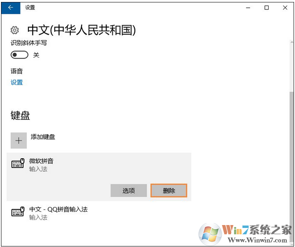 3、點擊“微軟拼音”選項就會出現(xiàn)“刪除”按鈕,點擊刪除就可以了。