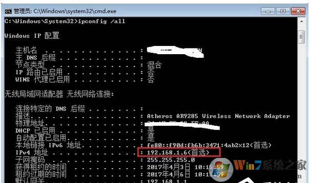 4、在彈出的黑框中輸入“ipconfig /all”,注意里面的斜杠是“/”不是“\”,在按“Enter”回車鍵,如下圖所示。紅色方框?yàn)殡娔X的IP地址,下面就是子網(wǎng)掩碼和默認(rèn)網(wǎng)關(guān)等信息。