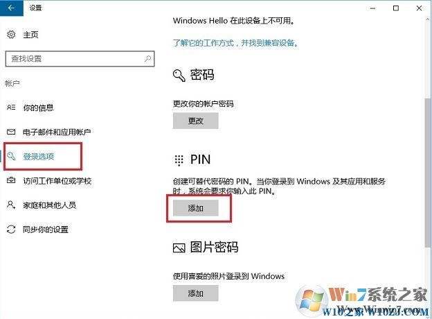 3、進(jìn)入賬戶設(shè)置界面后,再點(diǎn)擊左側(cè)的“登錄選項(xiàng)”,然后在右側(cè)就可以找到“PIN碼”功能了,點(diǎn)擊“添加”即可開始設(shè)置Pin碼;