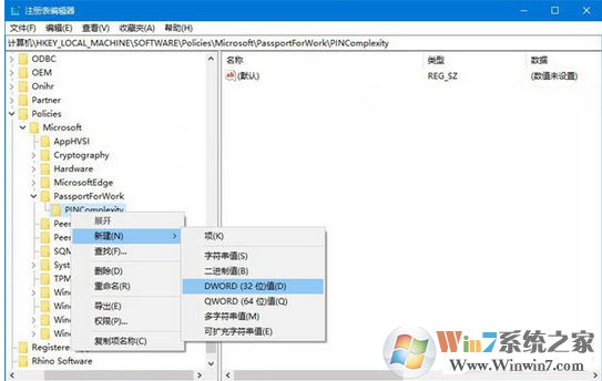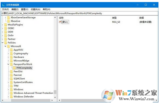 2、來到以下目錄(若無此目錄請手動新建):\HKEY_LOCAL_MACHINE\SOFTWARE\Policies\Microsoft\PassportForWork\PINComplexity\;