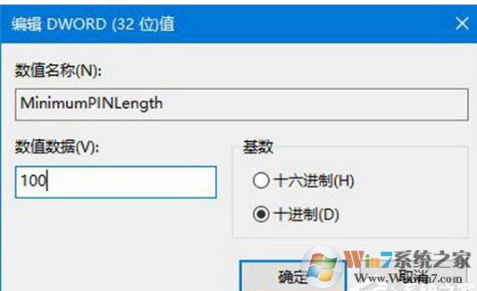 4、雙擊我們剛剛新建的名為MinimumPINLength的DWORD(32位)值,將基數(shù)設置為10進制,然后再將數(shù)值數(shù)據(jù)改為你期望的PIN碼長度的最小值。比如小編希望限定PIN碼的最短長度是100位,則在此處填入數(shù)字100,設置完成后,點擊確定按鈕;