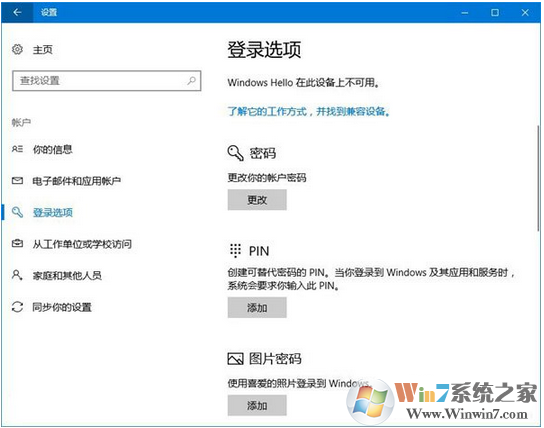 5、我們來退出注冊表編輯器,看看效果。依次進入設置-賬戶-登錄選項,在PIN設置段點擊添加按鈕;