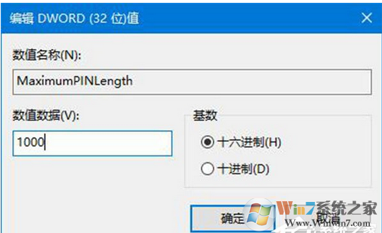 9、步驟和先前大同小異,即打開注冊表編輯器,在左側樹狀列表的PINComplexity項上點擊鼠標右鍵,新建名為MaximumPINLength的DWORD(32位)值,雙擊該值,將基數(shù)設置為10進制,將數(shù)值數(shù)據(jù)設置為你期望的PIN碼長度的最大值。比如小編希望限定PIN碼的最長長度是1000位,則在此處填入數(shù)字1000,然后點擊確定按鈕;